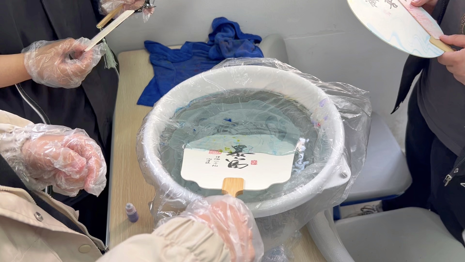 色交融:扇面垂直浸入水面,利用水的流动性让彩漆自然晕染,形成独一无二的图案,宛如开启“艺术盲盒”。