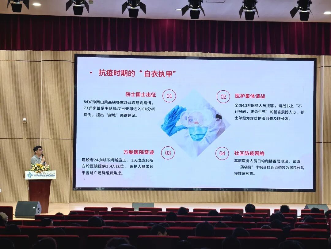 在 “航天科技中的诗意命名” 部分,郭骏副书记详细解读了 “神舟” 系列载人飞船、“玉兔” 月球车、“鹊桥” 中继星的命名由来。从 “神舟” 融合《诗经》古典意象与现代家国情怀,到 “玉兔” 延续嫦娥奔月神话并通过全球征名获百万网民支持,再到 “鹊桥” 借牛郎织女传说解决月球背面通信难题,生动展现了中国航天科技与传统文化的深度融合。 谈及 “危难时刻的温情符号”,郭骏副书记通过多个真实案例,讲述了不同群体在危机中的担当。抗震救灾时,消防员创造 “黄金 72 小时” 救援奇迹、解放军徒步挺进震中盲跳救援、基层干部放弃逃生机会守护群众;抗疫期间,钟南山、李兰娟院士逆行出征,建设者 3 天改造 16 所方舱医院,4.2 万医务人员援鄂请战;抗洪救灾中,官兵以人体筑堤、战士跳入冰窟救援,这些 “逆行” 身影与奉献故事,让在场学生深刻感受到危难面前的中国力量与温情。 在 “文化基因里的家国情怀” 板块,郭骏副书记指出,中秋时节航天员在太空站朗诵诗词、展示月饼,实现了传统节日与尖端科技的融合;武汉 “火神山”“雷神山” 医院命名源自五行文化,快速凝聚社会共识,创造 10 天建院奇迹;“加油”“众志成城” 等词汇从历史走向现代,经新媒体创作成为跨代际沟通桥梁,全方位呈现了中国式浪漫里的家国情怀。 此次 “先锋课堂” 思政教育活动,不仅让学生们深入理解了中国式浪漫的丰富内涵,更激发了大家的民族自豪感与责任感。未来,我院将持续开展此类思政活动,搭建学习交流平台,助力培养具有深厚文化素养与坚定理想信念的新时代人才。