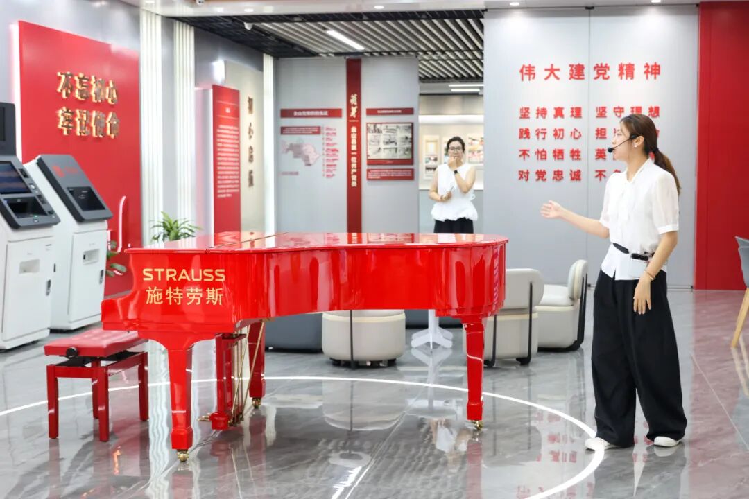 踏入金山区党群服务中心的瞬间,一架鲜红的钢琴静静立在入口处,红得热烈而庄重,仿佛是历史与时代共鸣的序曲,瞬间拉满了参观的仪式感。