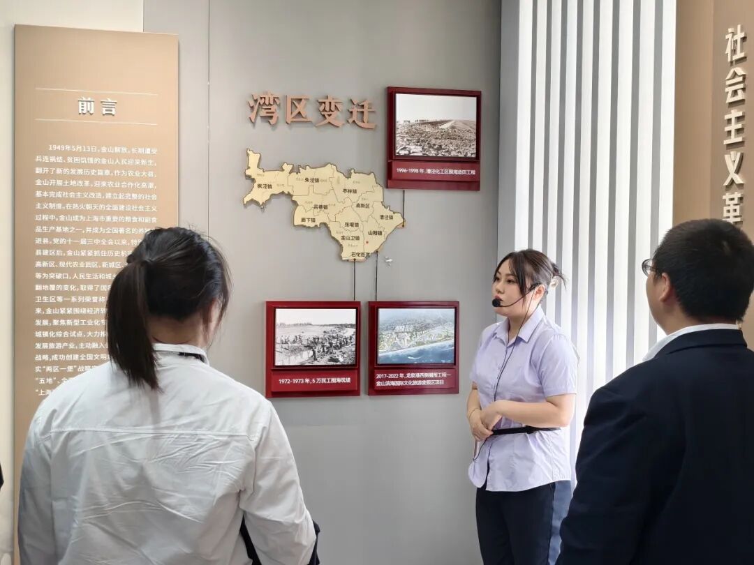 踏入中心,“不忘初心,牢记使命”的红色标语格外醒目,瞬间将人带入浓厚的红色氛围中。在“初心启航”展区,讲解员的细致解说带我们回溯历史:上海作为党的诞生地,早早对金山产生影响,1925年五卅运动中,张堰云溪小学的李一谔成为金山首位共产党员,此后中共金山特别支部建立,革命火种在这片土地点燃。展区里关于金山党组织变迁的展示,清晰呈现了从早期支部到县委的发展脉络,那些泛黄的历史照片、详实的文字记载,让我们仿佛看到革命先辈们为理想信念浴血奋斗的身影,深切感受到金山红色根基的深厚。