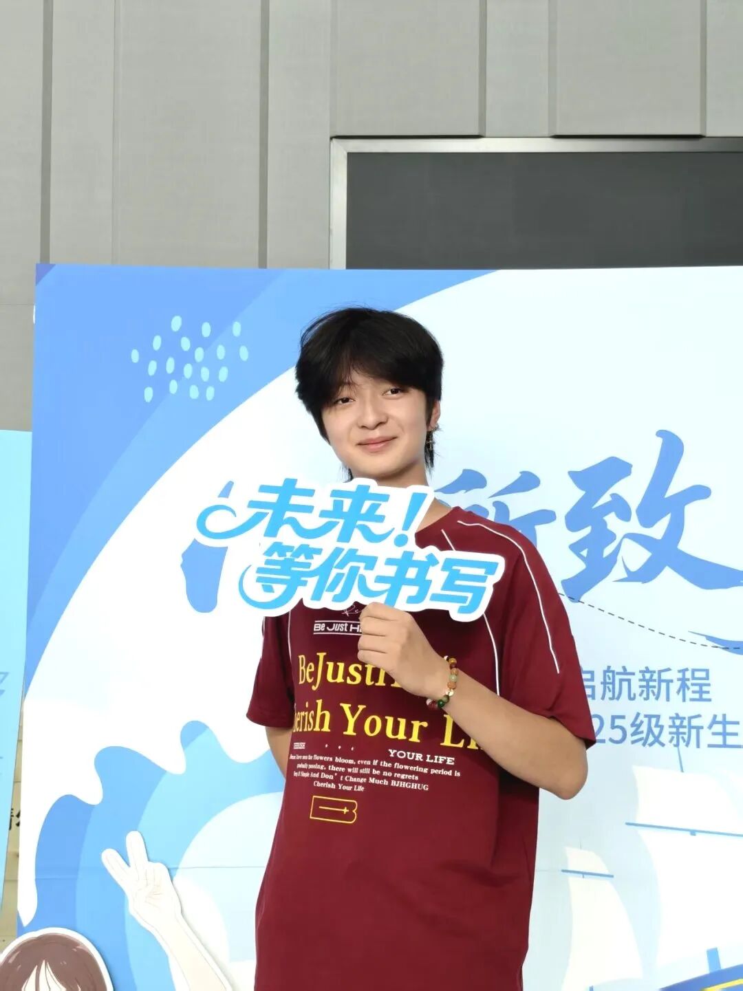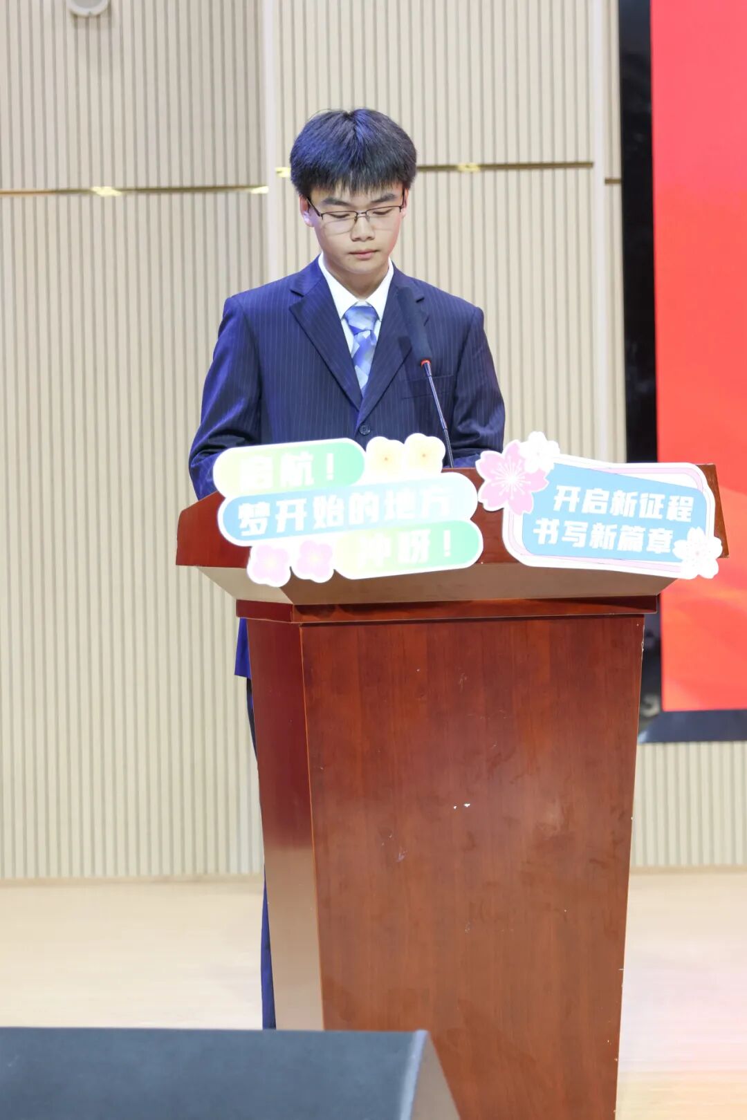 高一(1)班戴晨浩作为新生代表发言。他先向学校与老师们致感谢,坦言新生既存对未知的紧张,更怀对高中的憧憬 —— 将高中比作待阅的厚重书籍,藏着知识、思想碰撞与青春故事。他以 “初中筑基、高中建楼” 喻高中的关键意义,称虽有学业挑战与迷茫,但有师长指导、同窗相伴便无需畏惧。随后他倡议新生:尽快适应转角色,变 “被动接受” 为 “主动探究”;怀梦且务实,以认真态度逐梦;团结互助,在竞争中共成长。最后,他引 “长风破浪会有时” 明志,号召同学以梦为马、以汗为泉,誓以三年成长回报学校,并向师生与学校送祝福,尽显新生朝气与追求。