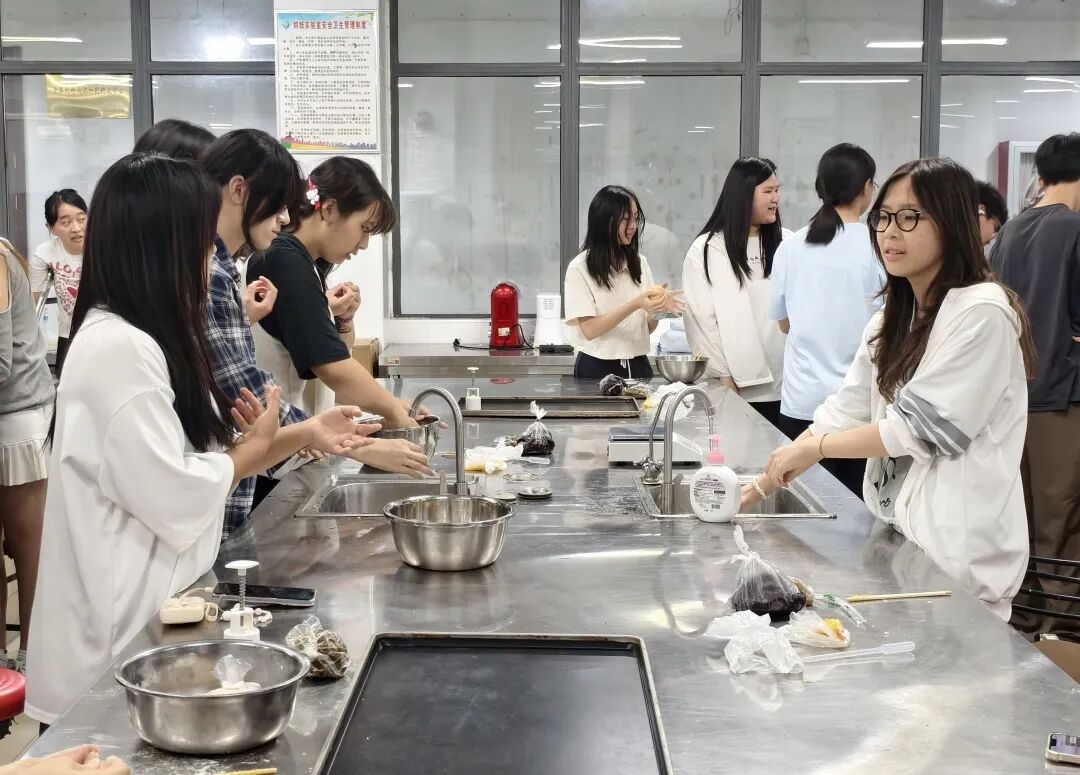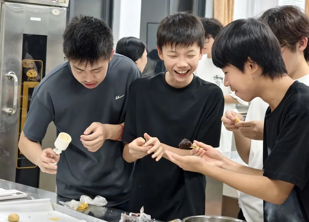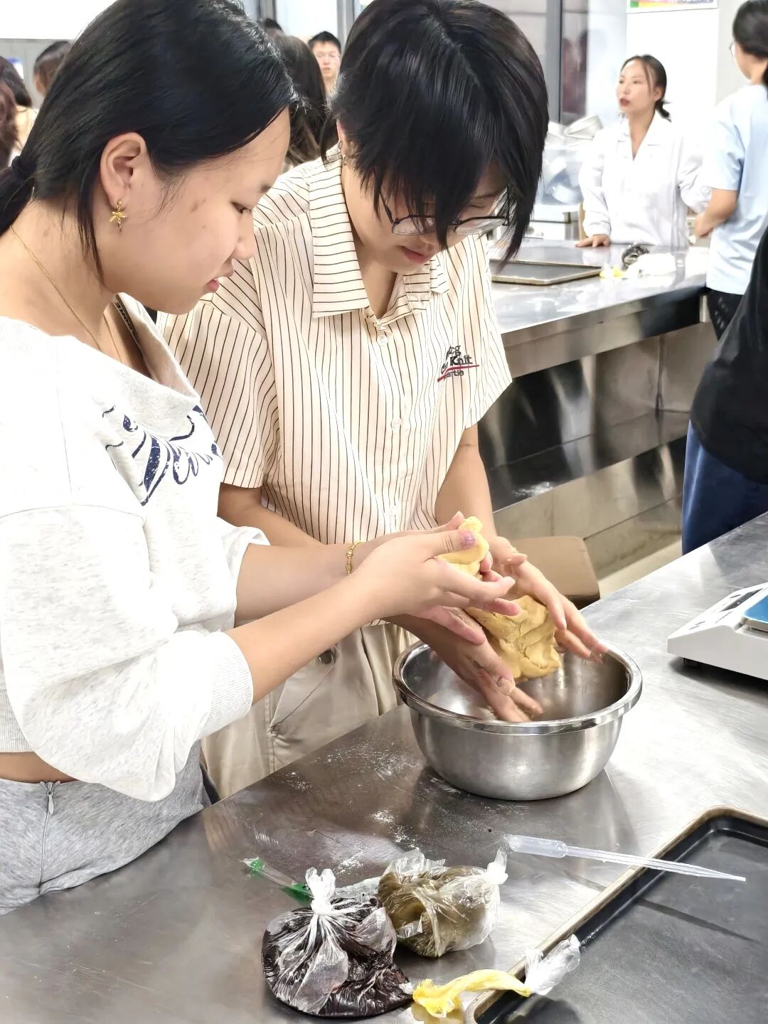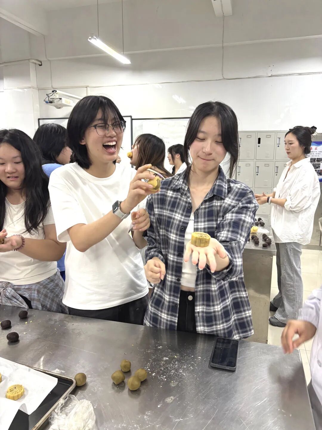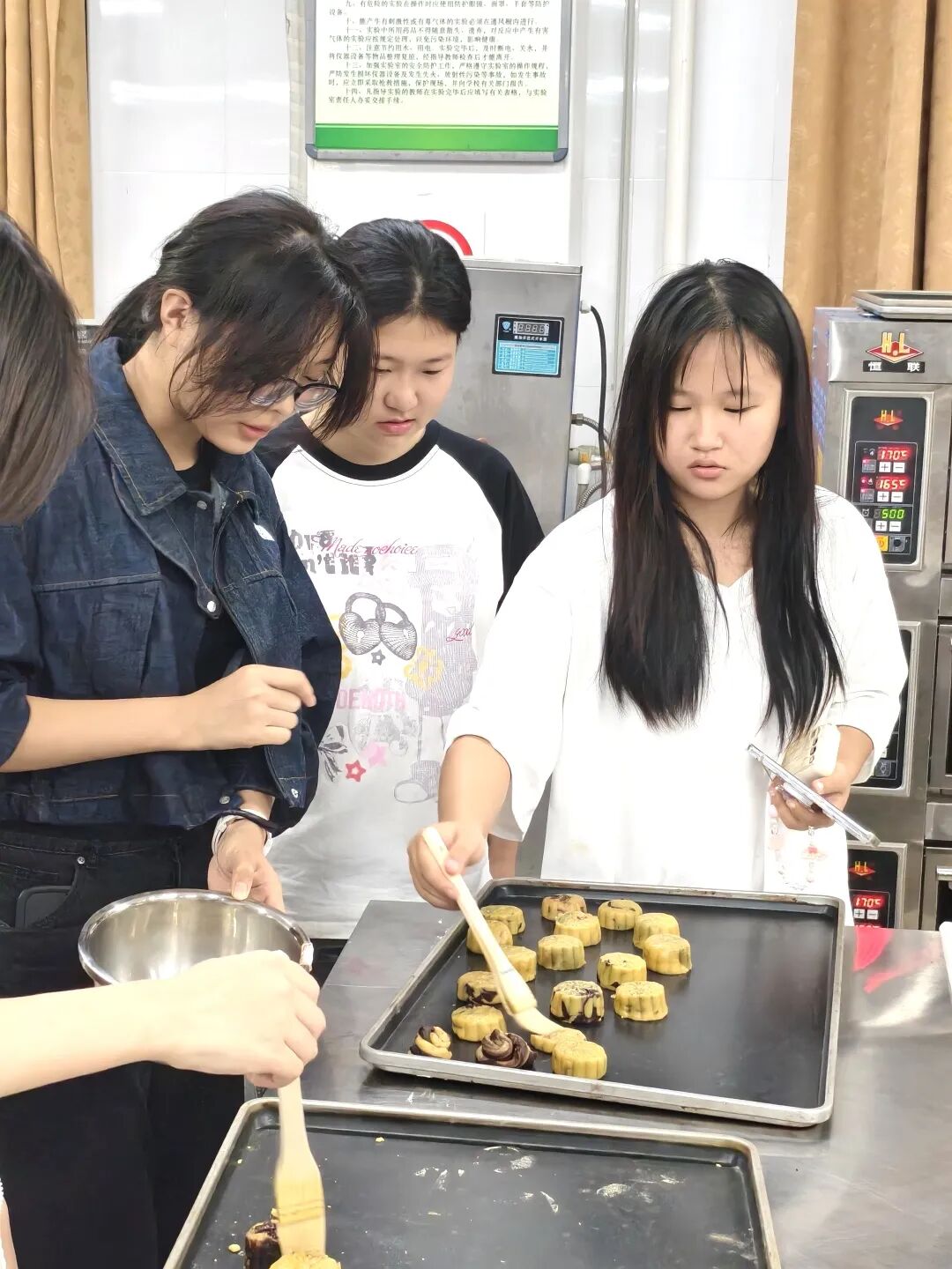 在专业老师的耐心指导下,同学们纷纷开始动手制作月饼。“揉面团要掌握好力度,让面团变得光滑有弹性才行。”“包馅料的时候要注意均匀,不然烤出来的月饼容易露馅。” 陈老师贴心地提醒同学们关键技巧。 同学们认真学习,一步步尝试:有的小心翼翼地揉着面团,有的专注地将馅料包进面皮里,还有的拿着模具,仔细地压出精美的花纹。过程中,大家时不时互相交流经验,遇到问题也及时向老师请教。当一个个带着精致花纹、形态各异的月饼胚完成时,每个人的脸上都洋溢着满满的成就感。 随后,这些充满心意的月饼胚被送入烤箱。等待的过程中,大家兴奋地讨论着自己制作的月饼,期待着成品出炉。当烤箱打开,浓郁的月饼香气瞬间弥漫整个活动现场。大家迫不及待地品尝着自己亲手制作的月饼,香甜的口感在口中散开,心中满是幸福。