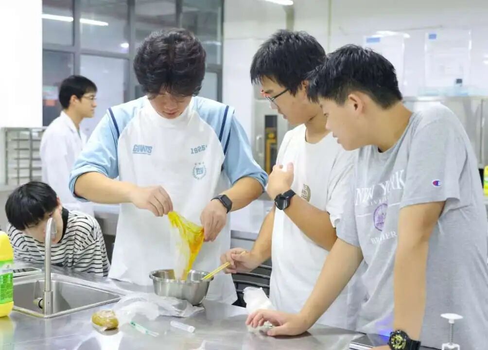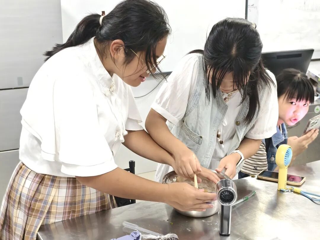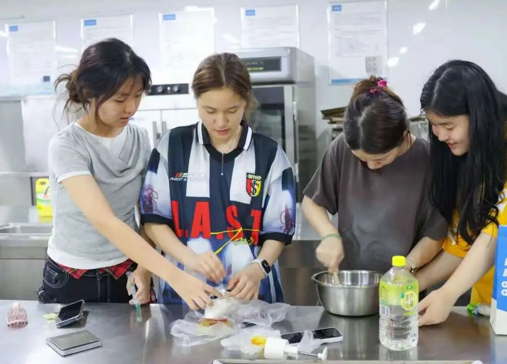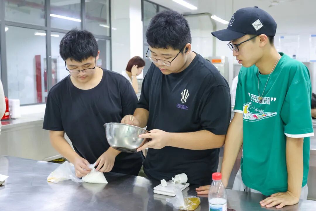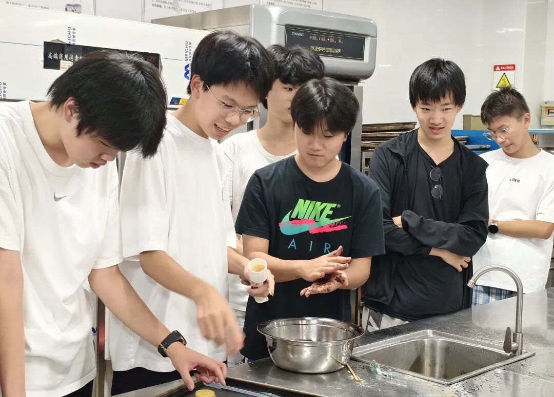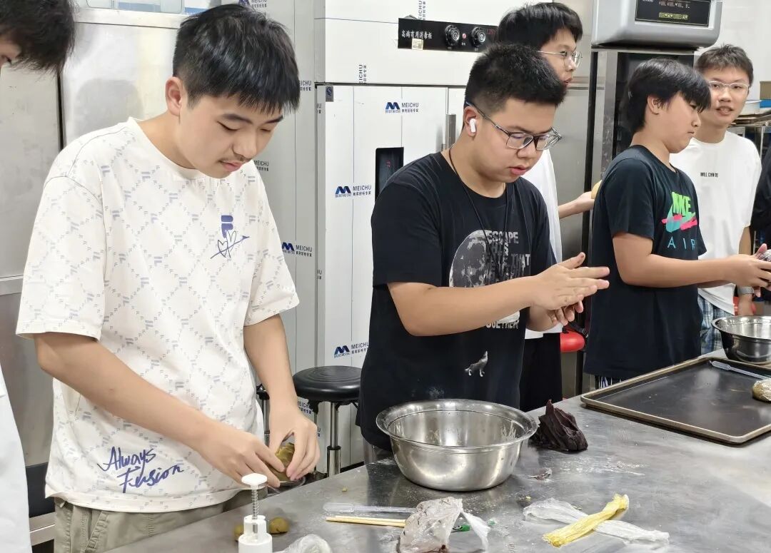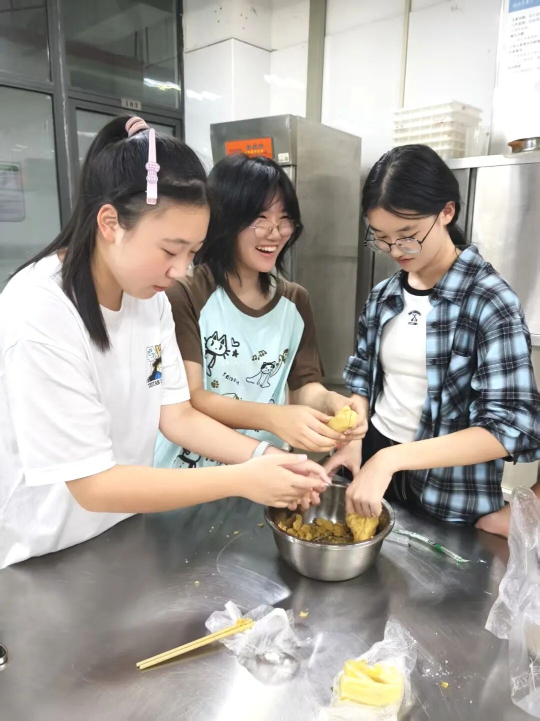 在专业老师的耐心指导下,同学们纷纷开始动手制作月饼。“揉面团要掌握好力度,让面团变得光滑有弹性才行。”“包馅料的时候要注意均匀,不然烤出来的月饼容易露馅。” 陈老师贴心地提醒同学们关键技巧。 同学们认真学习,一步步尝试:有的小心翼翼地揉着面团,有的专注地将馅料包进面皮里,还有的拿着模具,仔细地压出精美的花纹。过程中,大家时不时互相交流经验,遇到问题也及时向老师请教。当一个个带着精致花纹、形态各异的月饼胚完成时,每个人的脸上都洋溢着满满的成就感。 随后,这些充满心意的月饼胚被送入烤箱。等待的过程中,大家兴奋地讨论着自己制作的月饼,期待着成品出炉。当烤箱打开,浓郁的月饼香气瞬间弥漫整个活动现场。大家迫不及待地品尝着自己亲手制作的月饼,香甜的口感在口中散开,心中满是幸福。