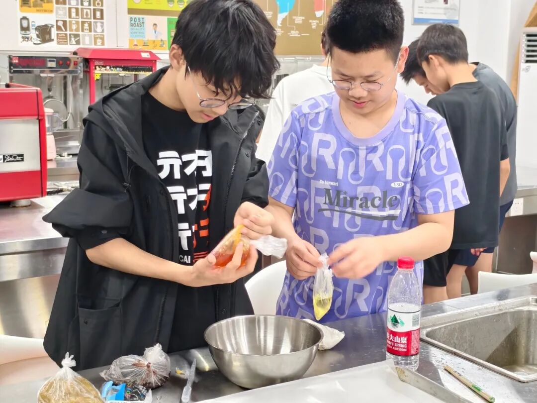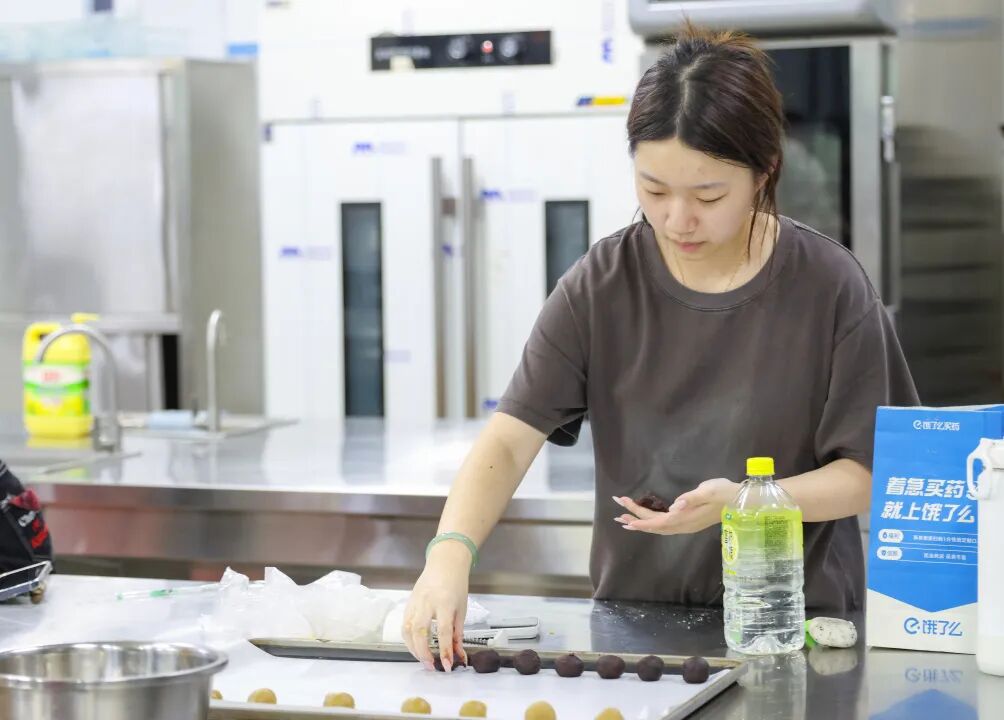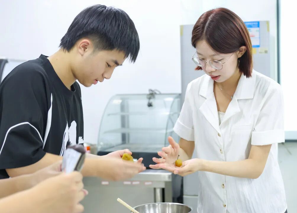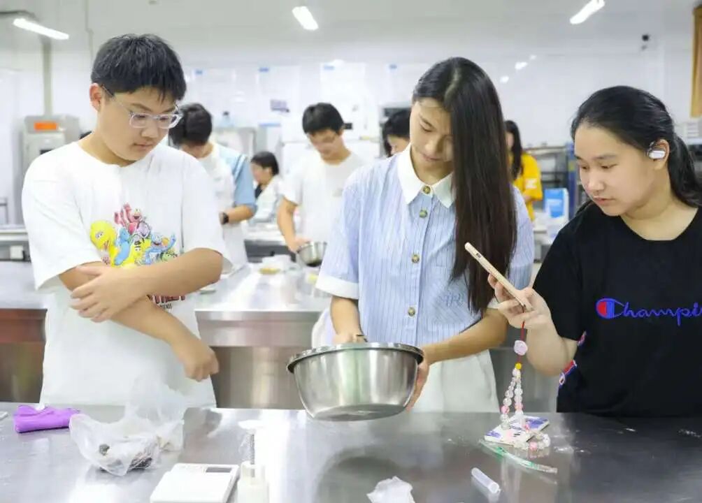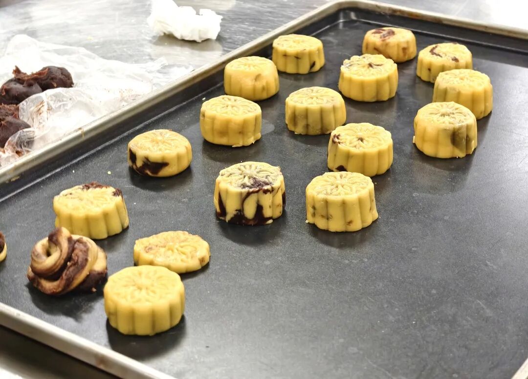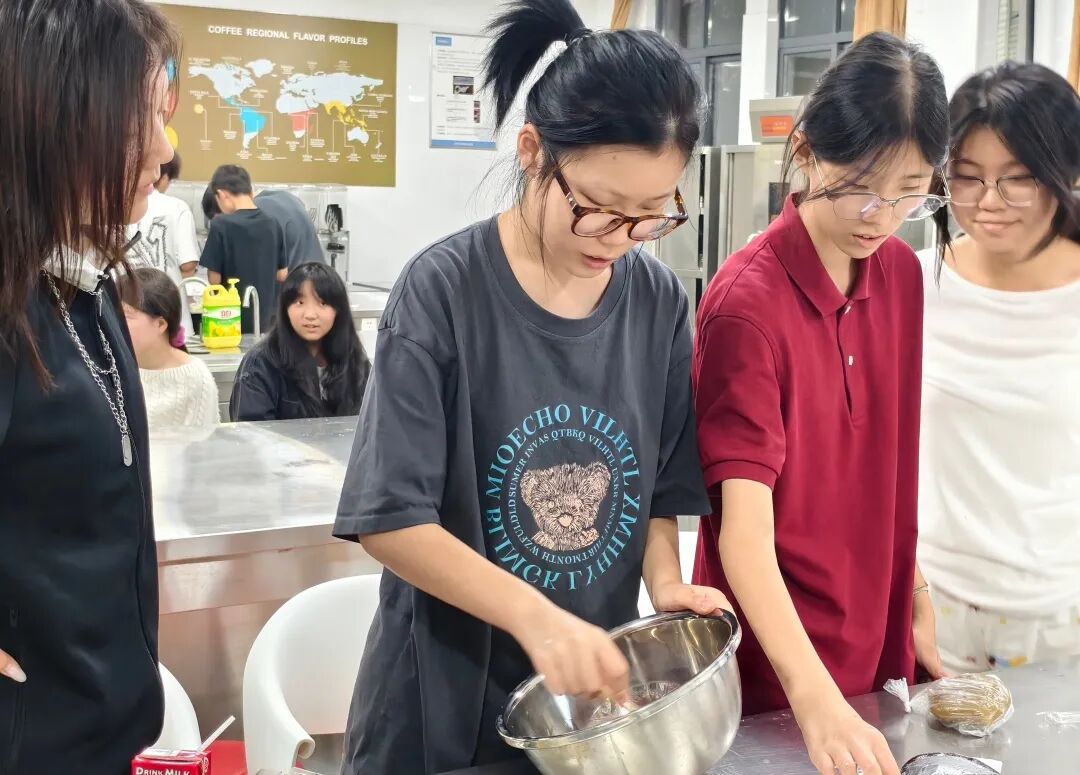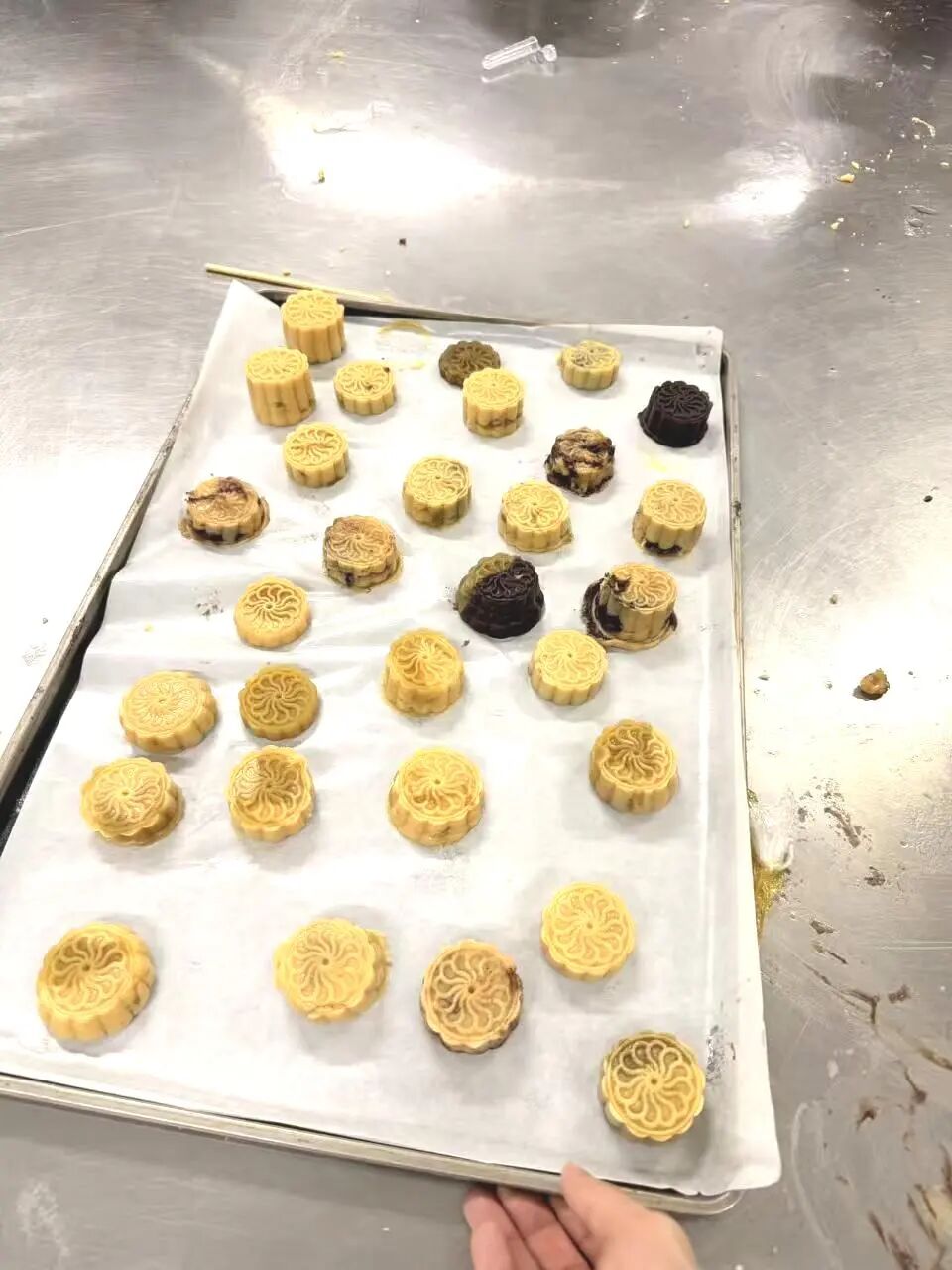 在专业老师的耐心指导下,同学们纷纷开始动手制作月饼。“揉面团要掌握好力度,让面团变得光滑有弹性才行。”“包馅料的时候要注意均匀,不然烤出来的月饼容易露馅。” 陈老师贴心地提醒同学们关键技巧。 同学们认真学习,一步步尝试:有的小心翼翼地揉着面团,有的专注地将馅料包进面皮里,还有的拿着模具,仔细地压出精美的花纹。过程中,大家时不时互相交流经验,遇到问题也及时向老师请教。当一个个带着精致花纹、形态各异的月饼胚完成时,每个人的脸上都洋溢着满满的成就感。 随后,这些充满心意的月饼胚被送入烤箱。等待的过程中,大家兴奋地讨论着自己制作的月饼,期待着成品出炉。当烤箱打开,浓郁的月饼香气瞬间弥漫整个活动现场。大家迫不及待地品尝着自己亲手制作的月饼,香甜的口感在口中散开,心中满是幸福。
